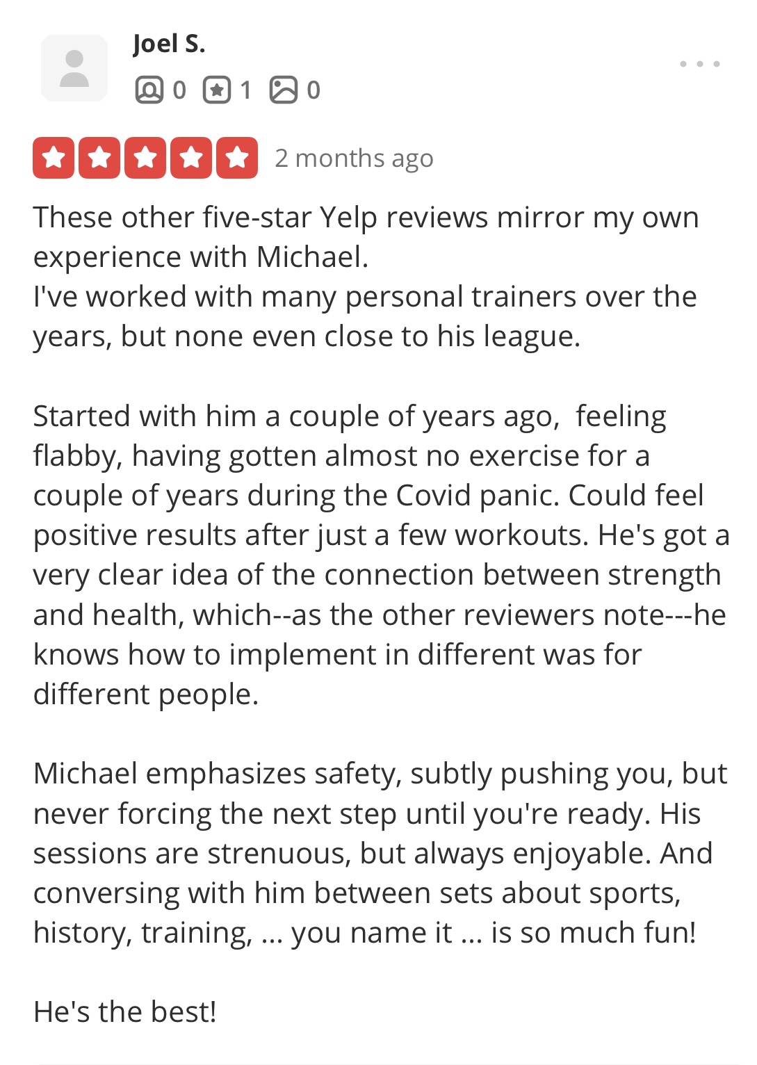 HI, I’m Michael. I run a unique private personal training studio in the Pearl district. I work with one (or two) people at a time with no distractions. I’ve been at this location for 4.5 years now and have been involved in health and fitness for more than a quarter of a century! I welcome people of all ages and especially enjoy working with seniors. It’s never too late to get stronger and take your health back! My style is science based and always focused on proper biomechanics. In my studio you will, perhaps, work harder – yet definitely more safely – than you ever have before.